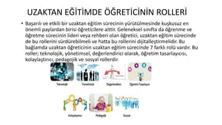 | Altıncı bölüm: Sonuç | Teknoloji ve pedagojinin entegrasyonu ile öğrenme süreçleri güçlendirilir; ölçümleme ve geri bildirim kritik rol oynar. | Uzaktan öğrenmede en etkili çözümler, dönüşüm ve sürdürülebilir başarı vaat eden yaklaşımlardır. |